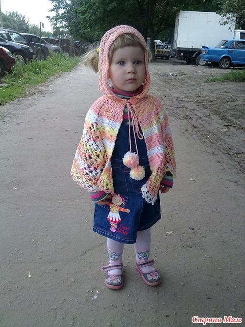 Связалось вот такое пончо из ниток Ализе, крючок №6. В оригинале капюшон был сплошной (связан столбиками), но я побоялась что не хватит ниток и сделала его тоже Соломоновыми петлями - получилось ажурно. Думаю что для Бабьего лета как раз подойдет.