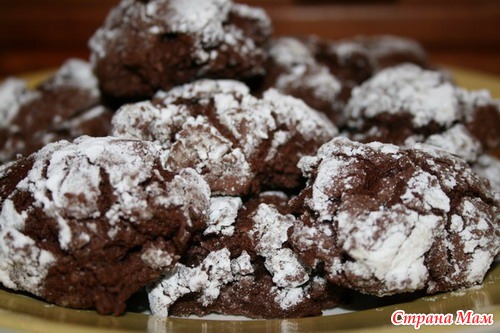 200 гр шоколада( черный) 90 гр слив.масла 100 гр сахара щепотка соли 3 яйца пакетик ванильного сахара 200 гр муки(стакан+1/2 стаканa) 2 ст.л. какао 1/2 пакета разрыхлителя 100 гр сахарной пудры(пакет) Растопить масло и шоколад на слабом огне до однородной массы, постоянно помешивая. Добавить сахар и ваниль, и хорошо перемешать до растворения сахара. Перелить в миску. Добавить по одному яйца и хорошо взбить миксером после каждого,примерно по 1 минуте я взбивала. Добавить муку,какао,разрыхлитель и хорошо размешать. Накрыть миску плёнкой и поставить в холодильник на один час для застывания теста. Застелить противень пергаментной бумагой. Насыпать сахарную пудру в небольшую миску. Чайной ложкой взять тесто и обвалять в сахарной пудре хорошо . Выложить на противень на расстоянии 4 см. Получается 36-40 штук. Печь примерно 15 минут при 160 градусов.