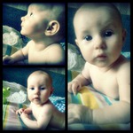 В общем, мы дамы уже совсем большие! Большую часть времени любим лежать на животе, пытаемся схватить руками резиновую лягушку, а если попадает в руки - то тащим ее в рот.