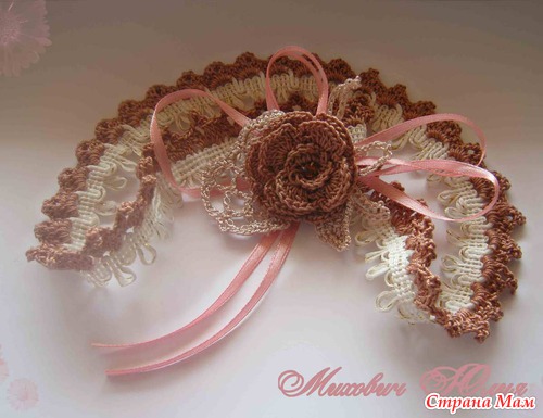 довязала листики цветочку, пришила ленту, бусину в серединку. И всю эту конструкцию пришила к повязке, прямо на шев, которым скрепились ее стороны.
