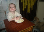 Мы потихоньку учимся кушать самостоятельно. Пока стараюсь чем-нибудь жидким Святу кормить ещё сама. А штучной едой она уже ловко справляется. А то, что разлетается по кухне, с удовольствием подбирает наш пекинес Тишка.