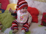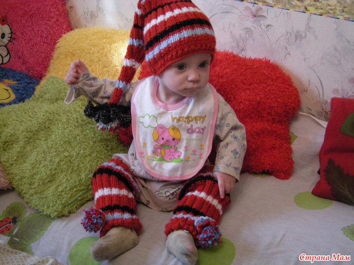 А я связала своей малышке слингокомплектик. Шапочка должна быть "бомбейская". Но так, как гетры связала резинкой 2х2, пришлось и шапочку вязать резинкой. Получился свой вариант "бомбейской2 шапочки.