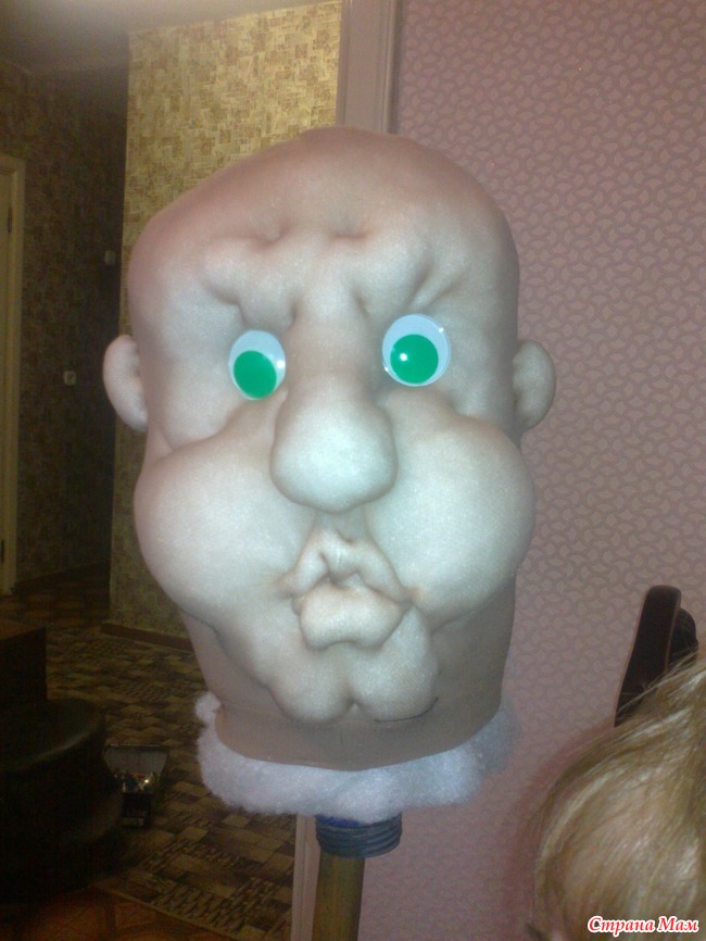 На пятилитровую бутылку намотали синтепон, обвязали леской, натянули колготки, надрали синтепон, сформировали морду