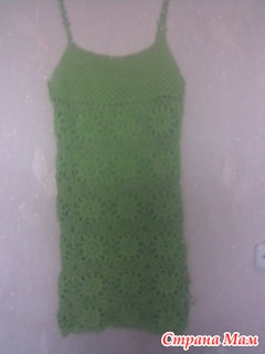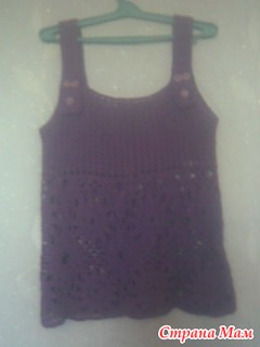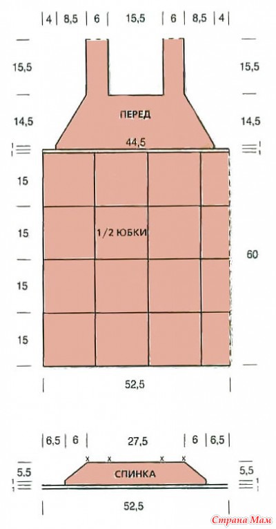 Перед: спереди на 32 ст. с/н вязать рельефным узором. Для пройм оставить с обеих сторон в каждом ряду 12 х 1 ст. с/н. Через 14,5 см = 13 р. от юбки оставить для выреза горловины средние 22 ст. с/н и обе стороны закончить раздельно. Для бретелей на внешних 8 п. вязать рельефным узором. Через 30 см = 27 р. от юбки работу закончить.