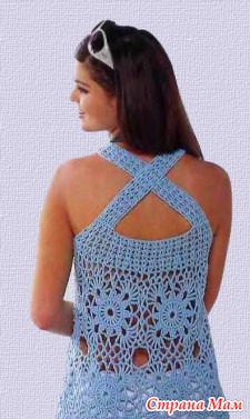 Спинка: на оставшихся 32 ст. с/н вязать рельефным узором, при этом 1 раз в 3-м раппорте и б раз в каждом следующем 4-м раппорте вместо 2 ст. с/н в 1 п. основания связать только 1 ст. с/н. Для пройм оставить с обеих сторон в каждом ряду 5 х 1 ст. с/н. Одновременно во 2-м р. одинарный ст. с/н и следующий ст. с/и (перед серединой) или ст. с/н перед одинарным (после середины) провязать вместе. Через 5,5 см = 5 р. от юбки работу закончить.