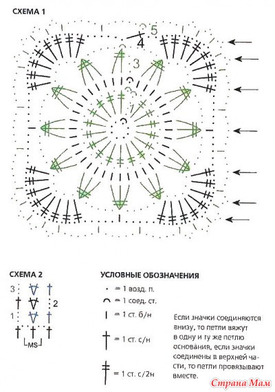 Квадрат: связать цепочку из 8 возд. п. и сомкнуть её 1 соед. ст. в кольцо. Далее вязать круговыми рядами по схеме 1. Выполнить 1 раз с 1-го по 5-й р.