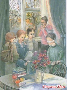 У мамы на глаза навернулись слёзы. Она провела друзей в комнату. Немного погодя, ощупывая путь рукой, к ним вышел Лёва с повязкой на глазах.
