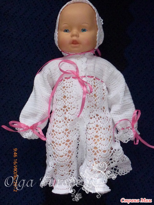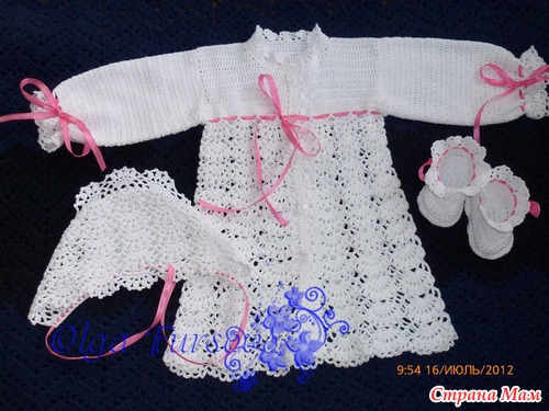 Комплект связан для маленькой принцессы крючком, нитки СОСО около 200 гр, крючок 2, для пинеток 1,5