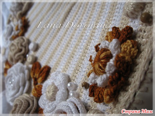 В своей сумочке я сделала вставку из искусственной кожи по бокам и низу, увеличив этим объем сумочки и из соображений "будет меньше пачкаться". Цветочки вязала всякие разные, какие только пришли в голову, дополнила декор бусинками и вязанными шариками (вяжутся, как серединка для мака в известной схеме - колечко из возд. п обвязывается СБН столько раз, пока крючок пролезает в серединку)