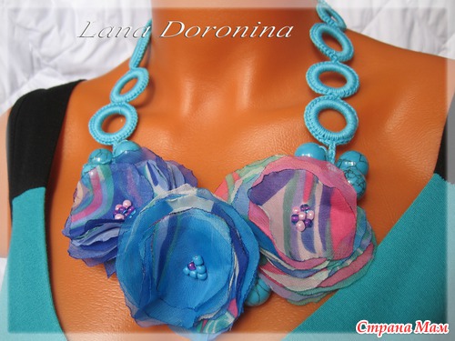 Колье "Воспоминания о море" - обвязанные колечки, бусины - бирюза, цветы из органзы (порезала старый шарфик