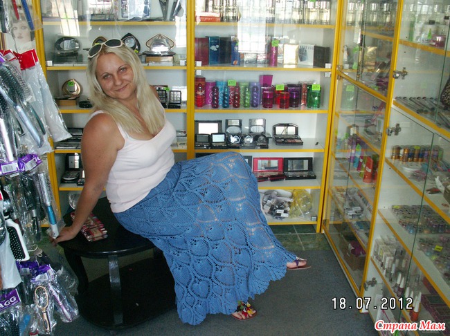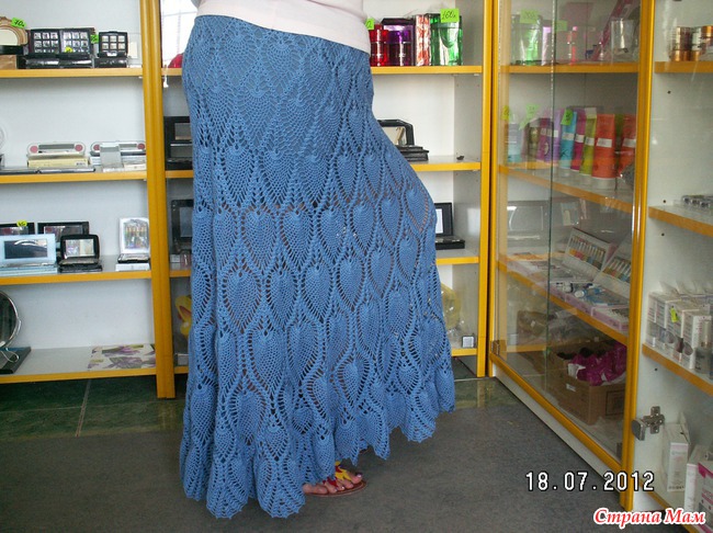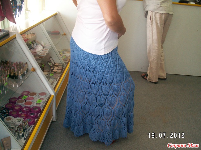 Увидев мою юбку"Каскады", подруга тоже захотела, но дублировать не люблю т. к у нас городок маленький. Решила связать ананасами, благо, что они ей нравятся.