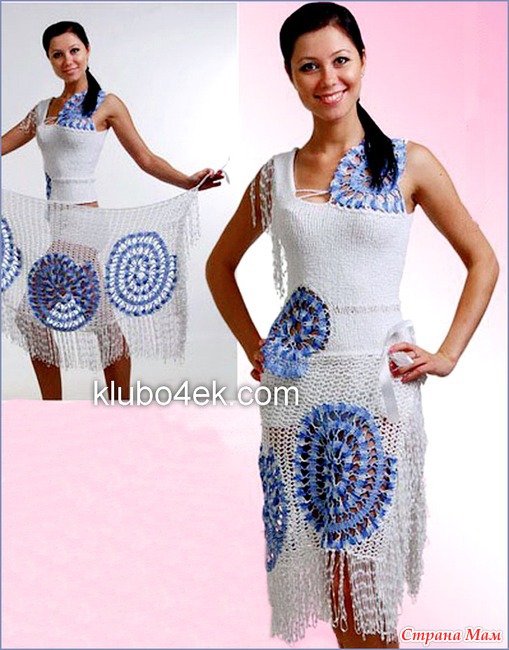 Вам потребуется: 150 г пряжи КАМТЕКС Хлопок стрейч» (98% хлопка. 2% лайкры. 160 м/50 г). 100 г пряжи loro 14. MADAME TRICOTE» (100% хлопка. 300 м/100 г) и 50 г фактурной пряжи «Tioro. MADAME TRICOTF (100% полиамида. 125 м/50 г) — вся пряжа белого цвета: 150 г меланжевой пряжи «MAXI. MADAME TRICOTE» (100%хлопка. 565 м/100 г) бело-голубых оттенков: спицы N» 4: крючки № 2 и № 5: 100 см атласной ленты белою цвета.
