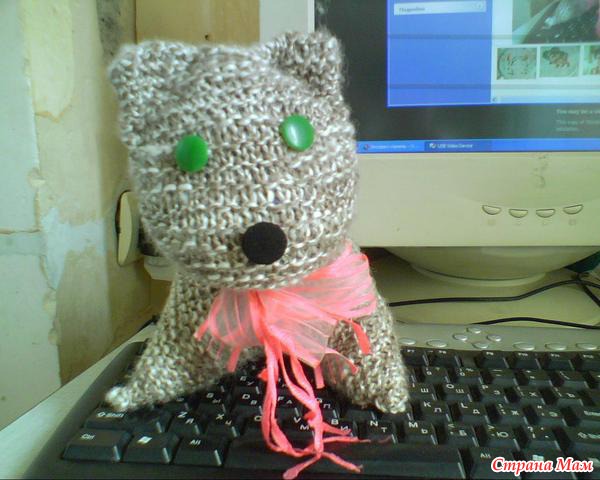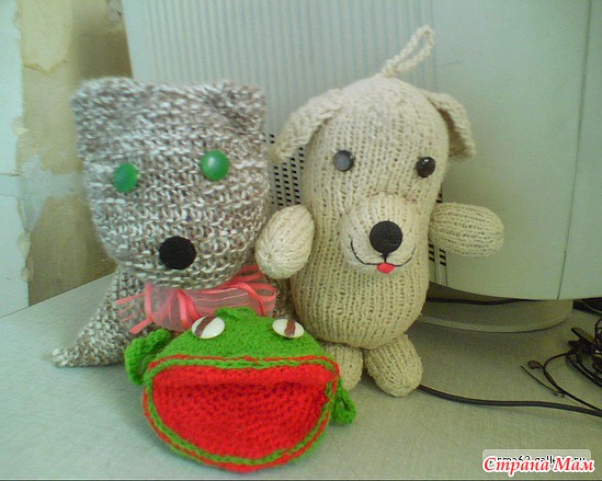 .Это мои первые попытки связать игршки(вернее были и маленькие на елку,но сын утащил в школу на выставку и не венули).Это самый примитивизм.Лягушка связана крючком,а собачка и котик спицами. У каждого из них своя история создания.