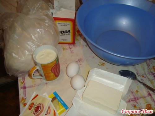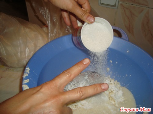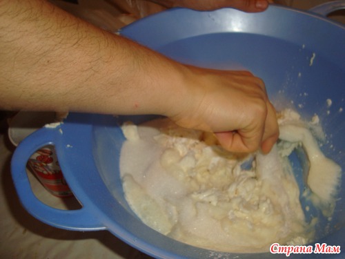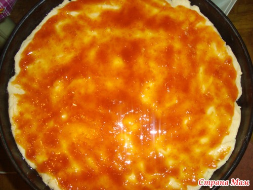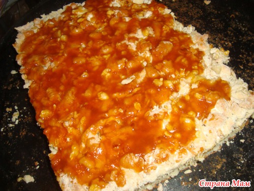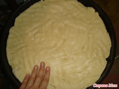 тесто делим на 2 части. первую часть уложим в противен. противен не чем смазывать не надо. тесто у нас намасленное.