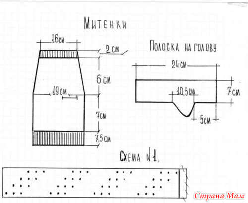 В журнале по вязанию "Любо Дело" я в прошлом году давала материал по вязаным аксессуарам. Там были вязаные галстуки с ручной росписью и митенки, а также комплекты полосочек на голову и митенок. Прилагаю выкройку на комплект.