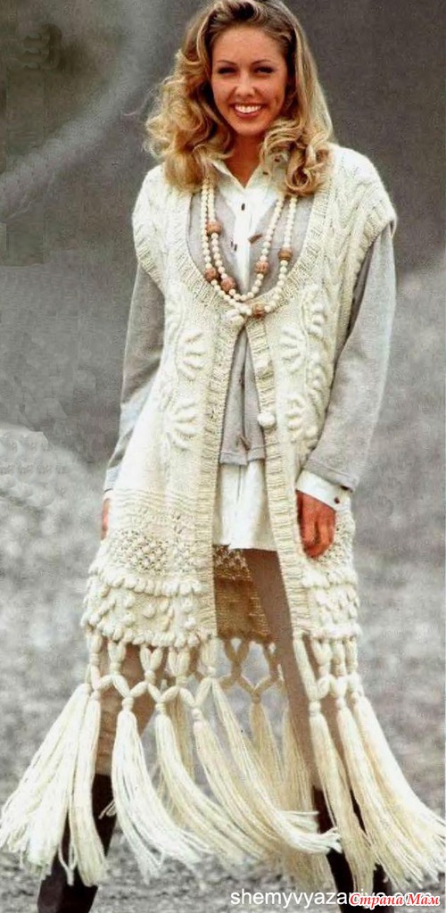 СБОРКА ЖИЛЕТА: на полочках вышить по рисунку двойной нитью участки, связанные лиц. гладью. По краю выреза горловины набрать 128 п. на круговые спицы и связать 4 см резинкой, закрыть петли по рисунку. По краям полочек, включая короткие стороны планки горловины, набрать по 104 п. и вязать резинкой. При этом на высоте 2 см выполнить на планке правой полочки 3 отверстия для пуговиц (закрыть 2 п. и в следующем ряду их снова набрать). 1-е отверстие для пуговицы выполнить, отступив 64 п. от нижнего края, следующие - с интервалом 14 п. На высоте планки 4 см все петли закрыть по рисунку. По краям пройм набрать по 108 п. и связать 4 см резинкой, петли закрыть. Для пуговицы связать 5 возд. п., * выполнить 8 ст. с/3н в 1-ю возд. п., при этом столбики провязывать не до конца; после того как на крючке окажется 9 петель, провязать их вместе, 5 возд. п., повторить еще 1 раз от при этом вместо 5 возд. п. связать 1 соед. ст. в петлю начала. Пуговицы пришить. По нижнему краю завязать кисти бахромы длиной 50 см (для каждой кисти нарезать по 8 нитей длиной 1 м) и завязать их 2 раза через 5 см со смещением (см. фото).