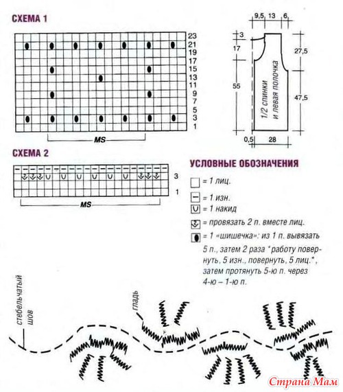Волнистый узор: число петель кратно 18 + 2 + 2 кром. Вязать по схеме 2, на которой приведены лиц. и изн. р. Начинать с 1 кром. и петли перед раппортом, повторять раппорт, заканчивать петлей после раппорта и 1 кром. Повторять с 1-го по 4-й р.