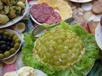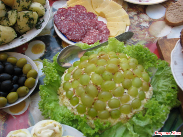 Слои повторить, каждый смазать майонезом и посыпать небольшим количеством измельченного миндаля.А последний слой - это нарезанные пополам красивые большие зеленые виноградины. Они укладываются плотно, срезом вниз.