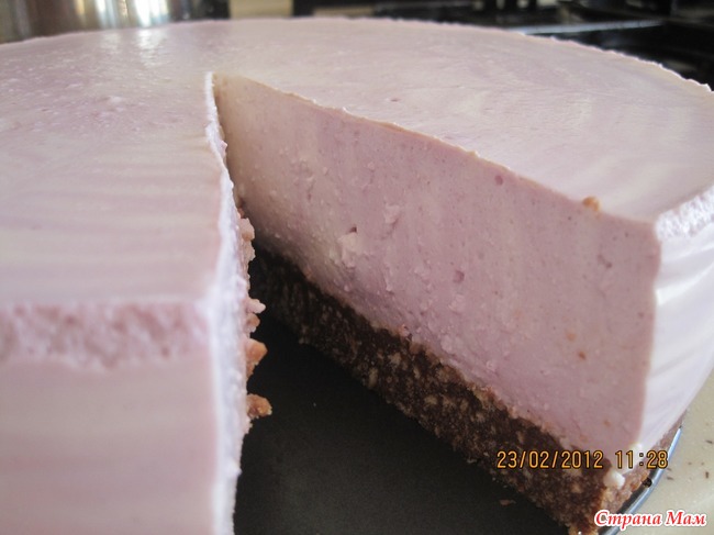 Рубим печенье в мелкую крошку и перемешиваем со сливочным маслом растопленным. Кладем на дно формы (желательно разъемной) и ставим в холодильник, чтобы застыл.