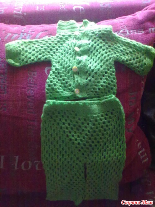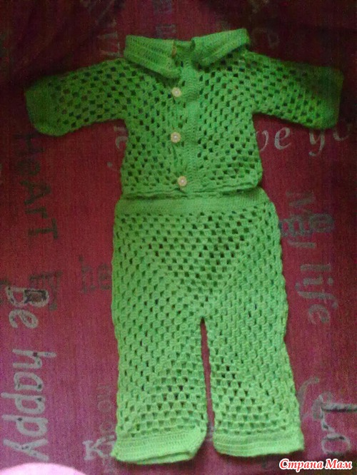 Костюмчик вязала для своего Малыша, который появиться уже вот - вот, связала за неделю. Правда это самая большая для меня работа, потому как вяжу недавно и есть маленькие огрехи. Думаю будет великоват, ну ничего на вырост!