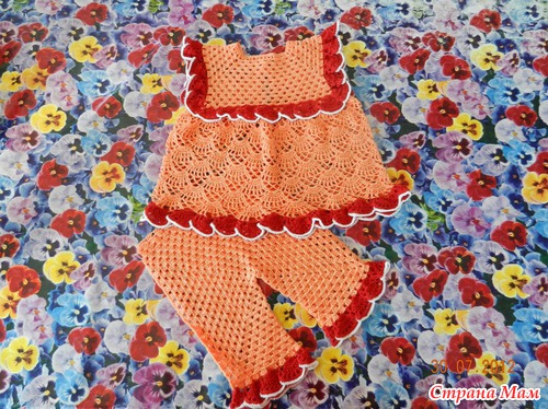 Место для резинки не довязанно, планирую этими же нитками двойной резинкой, спицами и вставить резинку внутрь. Костюм ждет предварительной примерки, после которой определим место талии точнее.
