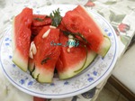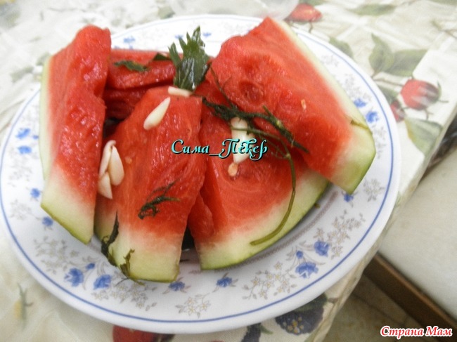 И арбуз, порезав так, что бы кусочки входили в горлышко банки. Заливала кипятком минуты на 3-5, сливала воду, доводила её до кипения, растворяла соль и сахар. На такой бутылек брала 1 ст. л. соли и 2 ст. л. сахара. Бросала в бутыль 2-3 таблетки аспирина. Заливала рассолом. И закатывала.