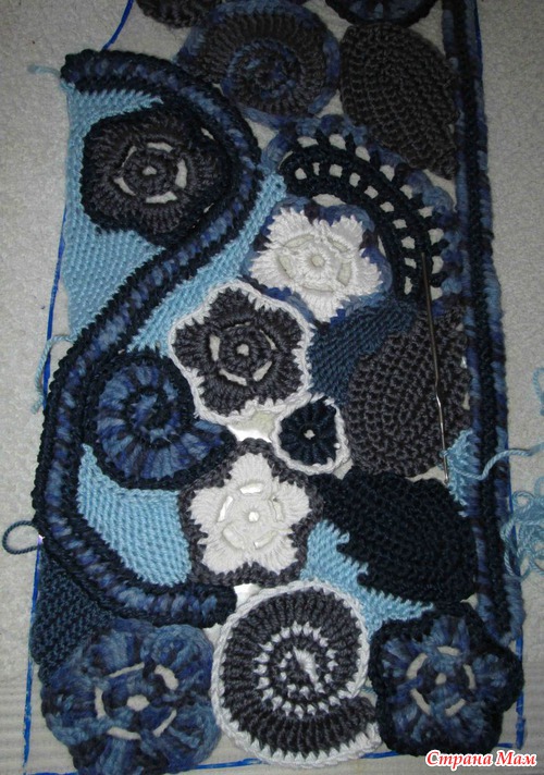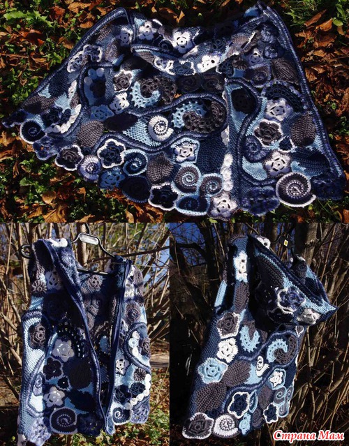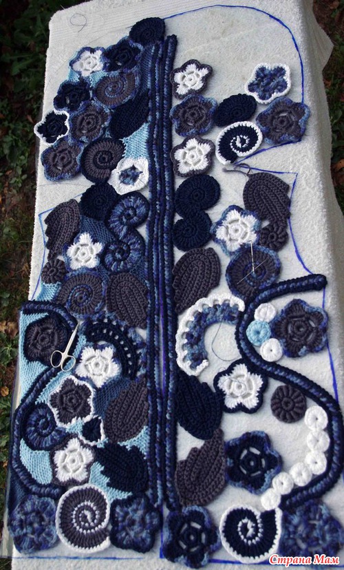 Долго не выставляла отчет - думала что доделаю вторую половину переда, но все не получается. Все навязанные элементы уходят на перед и капюшон. Теперь возникает вопрос, что делать со спинкой. Ниток осталось мало; два темно синих клубочка и 1,5 темно серого акрила, нашла еще неполный белый гизу, но этого на элементы все равно не хватит. Два цвета которым соединяю элементы вязать не планировала. Была шальная мысль связать гладью спинку - но решила пока бороться до конца