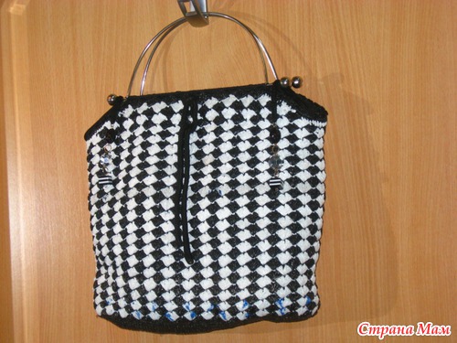 Ну особо и не чего сказать,покупаем пакеты нужного цвета или берем из имеющихся в наличии,надо брать одной плотности и поплотнее,режем по кругу,сматываем,сама сумка связана без схемы на глаз,рисунок обычные ракушки,ст/сн вот вроде и все....