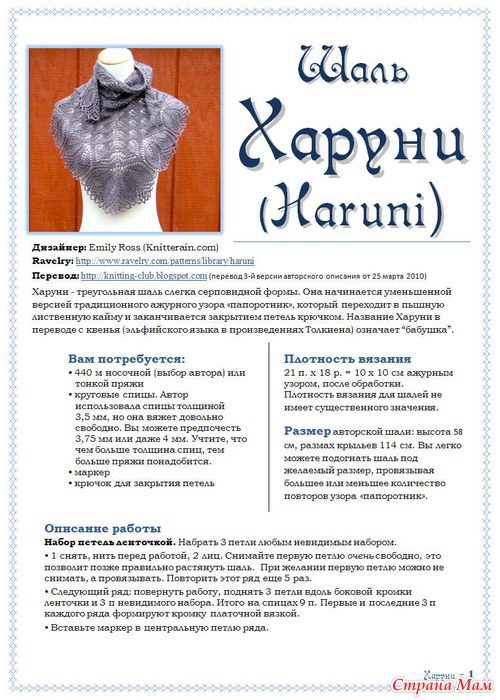 Харуни - треугольная шаль слегка серповидной формы. Название Харуни в переводе с квенья (эльфийского языка в произведениях Толкиена) означает “бабушка”. Читать полностью