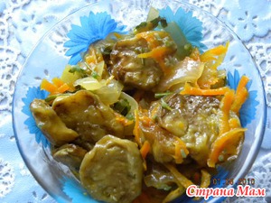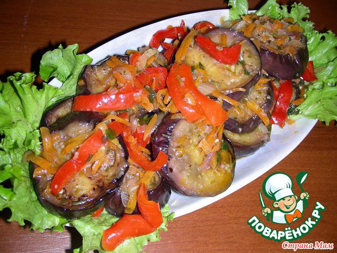 Баклажаны порезать толстыми кружочками, посолить и оставить на полчаса-час, чтоб стекла горечь. Далее поджарить. Жарить нужно не до полной готовности, а слегка, с одной и с другой стороны.