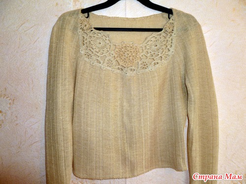 И тут пришла мне в голову мысль сделать крючковую вставочку. Да и ниточки нашлись подходящие, и люрексовая катушечка! Мотивы навязала самые простые, и вот результат!А это вставочка поближе.
