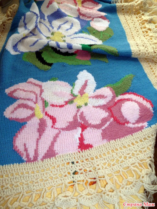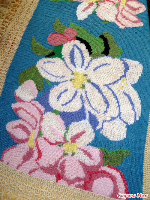 . Распустила я плечи до горловины, резинку отрезала, а спинку распустила снизу до уровня лопаток (там узор заканчивался). Состыковала эти два прямоугольника между собой, обвязала каймой-бахромой - и появился на свет плед "Яблоневый цвет"!