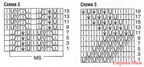 Узор для рукавов: число петель кратно 10 + 1+2 кром. Вязать по схеме 2, на которой приведены только лиц. р., в изн. р. все петли вязать по рисунку, накиды - изн. Начинать с 1 кром., повторять раппорт, заканчивать петлей после раппорта и 1 кром. Повторять с 1-го по 16-й р. Платочная вязка: лиц. и изн. р. - лиц. п. Узор из зигзагов (из 10 п.): вязать по схеме 3, на которой приведены только лиц. р., в изн. р. все петли и накиды вязать изн. Повторять с 1-го по 20-й р.