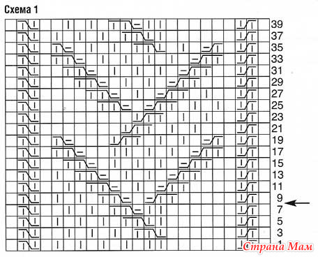 Резинка: число петель кратно 4 + 2. Лиц. р.: * 2 лиц., 2 изн., повторять от *, 2 лиц. Изн. р.: петли вязать по рисунку. Узор из кос (из 23 п.): вязать по схеме 1, на которой приведены только лиц. р., в изн. р. петли вязать по рисунку. Повторить 1 раз с 1-го по 40-й р., затем повторять с 9-го по 40-й р. Изн. гладь: лиц. р, - изн. п., изн. р. -лиц. п.