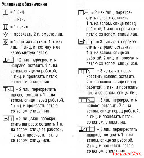 Лиц. гладь: лиц. р. - лиц. п., изн. р. - изн. п. Плетеный узор: число петель кратно 6 + 2 кром. 1-й р.: кром., * 6 п. перекрестить налево (= оставить 3 п. на вспом. спице перед работой, 3 лиц. и провязать петли со вспом. спицы лиц.), повторять от *, кром. 2-й - 4-й и 6-й - 8-й р.: лиц. гладь. 5-й р.: кром., 3 лиц., * 6 п. перекрестить направо (= оставить 3 п. на вспом. спице за работой, 3 лиц. и провязать петли со вспом. спицы лиц.), повторять от *, закончить 3 лиц., кром. Повторять с 1-го по 8-й р.