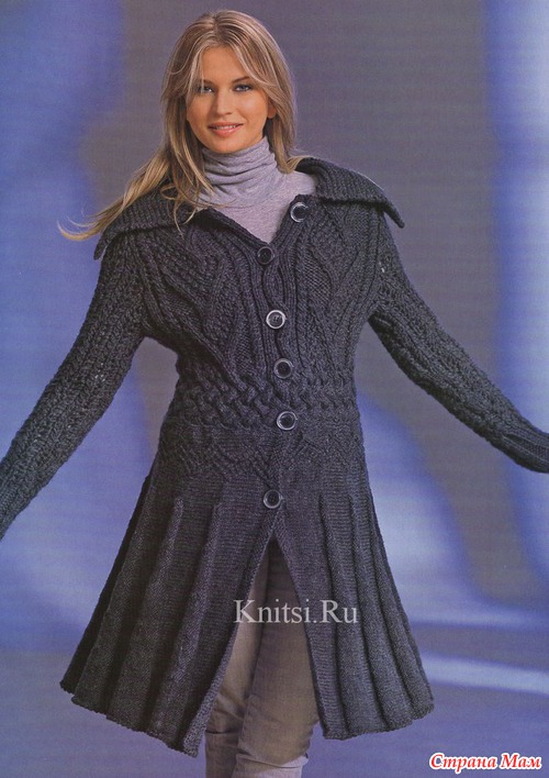 Спинка и полочки: на длинные круговые спицы набрать двойной нитью для полочек по 42 п., для спинки 74 п. и связать на всех 158 п. для планки на талии 8 см = 18 р. плетеным узором, при этом в последнем изн. р. равномерно убавить на первых 42 п. 3 п., на следующих 74 п. 5 п. и на последних 42 п. 3 п.-147 п. Затем вязать следующим образом: кром., 6 п. резинки (= планка), 23 п. узора из кос, 18 п. резинки, 23 п. узора из кос, 5 п. изн. глади, 23 п. узора из кос, 18 п. резинки, 23 п. узора из кос, 6 п. резинки (= планка), кром. Кром. вязать как для узелкового края = в каждом р. вязать лиц. Через 12 см = 20 р. от конца плетеного узора продолжить работу для пройм следующим образом: провязать по узору и отложить для правой полочки 37 п., закрыть следующие 4 п., провязать по узору и отложить для спинки 65 п., закрыть следующие 4 п. и на оставшихся 37 п. продолжить вязать по узору левую полочку, при этом закрыть с края проймы в каждом 2-м р. 1 х 2 и 3 х 1 п. = 32 п. Через 29,5 см = 50 р. от конца плетеного узора закрыть для выреза горловины с левой стороны 8 п. и в каждом 2-м р. 1 х 4,1 х 2 и 3 х 1 п. Одновременно через 35,5 см = 60 р. от конца плетеного узора закрыть для скоса плеча с края проймы 8 п. и через 36,5 см = 62 р. от конца плетеного узора закрыть оставшиеся 7 п. плеча. Правую полочку начать с 1 изн. р. и симметрично вязать первые 37 п. Одновременно выполнить следующим образом 3 отверстия для пуговиц: в 21-м, 33-м и 45-м р. от конца плетеного узора закрыть средние 2 изн. п. планки и в следующем р. их снова набрать. Затем вязать по узору на средних 65 п. спинку, начав с 1 изн. р. и выполнить с обеих сторон проймы как на полочках - 55 п. Через 34 см = 58 р. от конца плетеного узора закрыть для выреза горловины средние 21 п. и обе стороны закончить раздельно. Для закругления закрыть с внутреннего края в следующем 2-м р. 1 х 2 п. Одновременно со 2-м убавлением выреза горловины закрыть для скосов плеча с обеих сторон 8 п. и через 36,5 см = 62 р. от конца плетеного узора закрыть оставшиеся 7 п. плеча с каждой стороны.