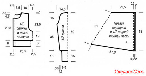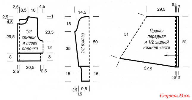 Внимание! Сначала вязать верхнюю часть, для этого вязать спинку и полочки целиком до начала пройм, затем все детали заканчивать раздельно. После этого вязать рукава, в конце связать нижнюю часть вместе с годе целиком поперек. Стрелка на выкройке = направление вязания.