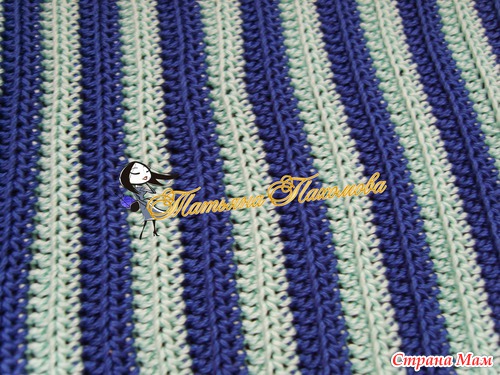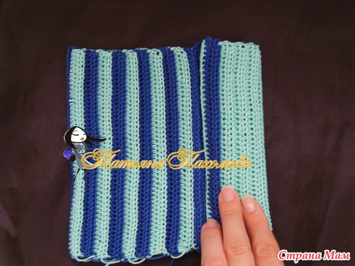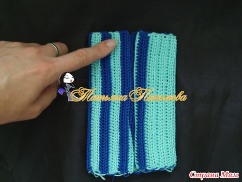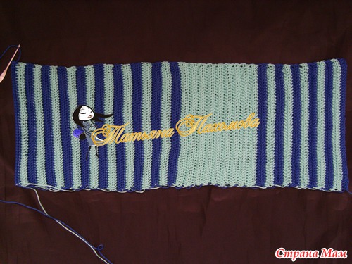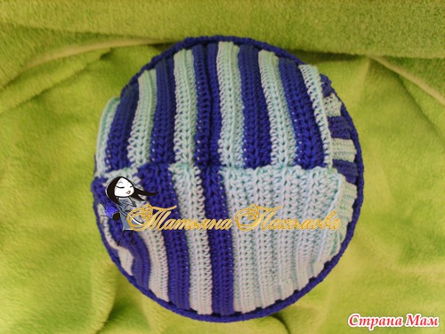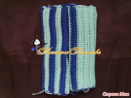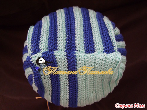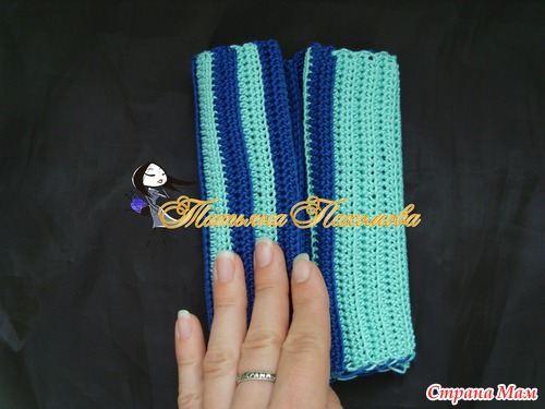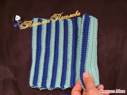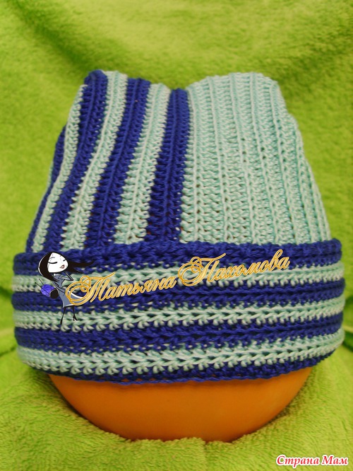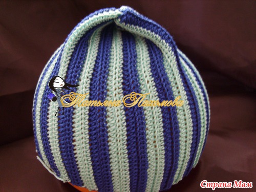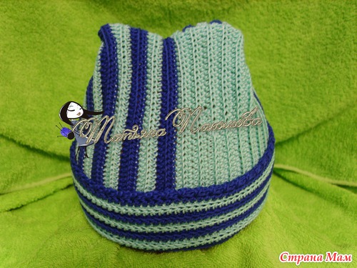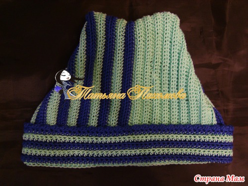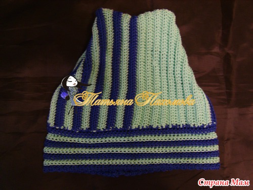 Вяжется очень просто. Вяжем прямоугольник, высота=высоте шапочки, длинна=обхвату. Я вязала полустолбиками, за заднюю дольку петли, по 2 ряда каждым цветом.