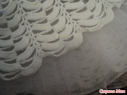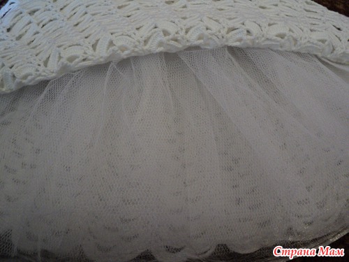 Связано ниточками Пехорка "Детский хлопок" крючок 1,90, подклад 2 слоя - фатин, 1 слой нижний - органза. Так как фатин немного колется пришлось придумать что-нибудь, под руки попалась органза - мягкая, нежная, воздушная.