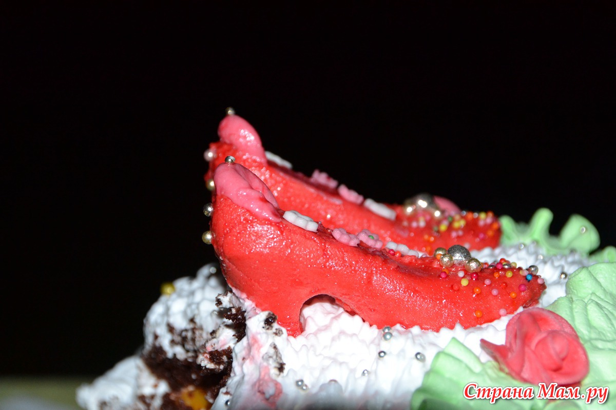 Ой. многостродальный тортик вышел - сначала корж развалился, потом после ливневых дождей все высушенные изделия стали сырыми, корона сломалась-еле держалась-да и когда приляпала-уже поняла, что ее надо было не туда ставить, но уже она была настолько мягкая, что не взять-но жду тапок-вот что получилось = это в подарок племяшке на 15летие..