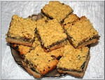 На разогретый протвень натираем(!) на крупную терку 3 части теста. Кладем протвень в разогретую духовку на 3 минуты(просушить тесто). выкладываем начинку. Сверху натираем(!) на крупную терку оставшиеся 3 части теста. Выпекать до золотистого цвета(где-то 20-30 минуток при температуре 200*С). Горячий(!) пирог нарезаем на квадраты(или ромбы, но не мелкие) выкладываем на блюдо, даем остыть.