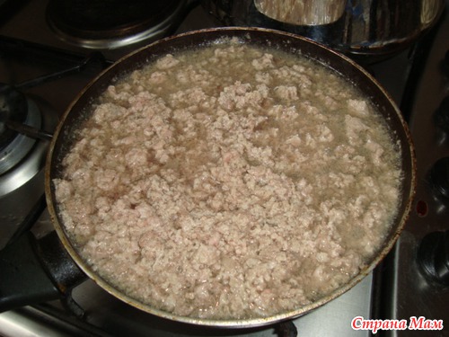 жарим фарш. сначала добавим немного воды. когда вода испариться добавим немного масло и пожарим фарш