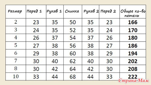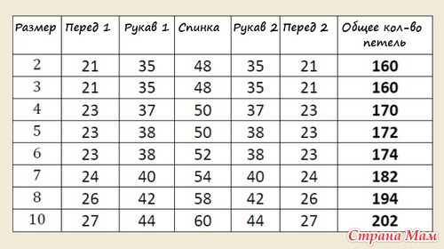 Чередовать прибавочные ряды (в ИР вязать изнаночными) пока число петель не достигнет следующих значений (см. таблицу ниже):
