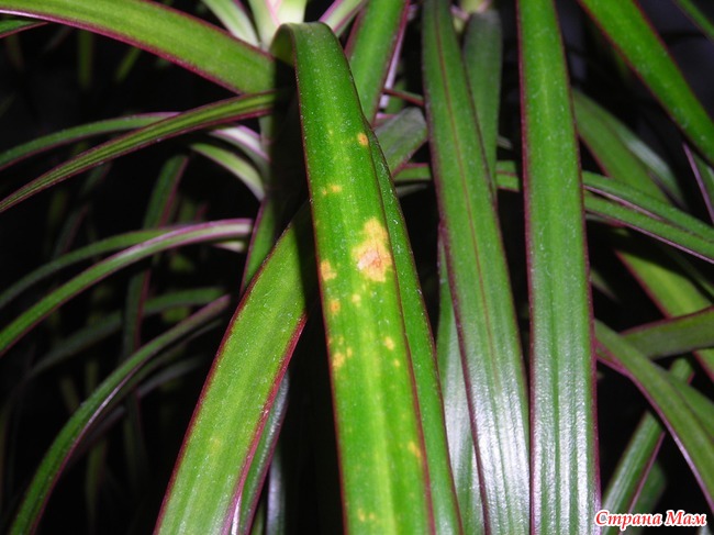 У меня уже несколько лет дома есть драцена. Росла, радовала, все нормально. Но вот начала портиться.Почитала в инете, но как-то непонятно, отчего на ней появились такие пятна. Знающие любители цветов, подскажите, пожалуйста, как мне ее спасти! Поливаю не часто раз в неделю примерно, последнее время, когда она "заболела", стала опрыскивать 2 раза в день, но пятна продолжают увеличиваться.