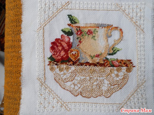 Девочки, наш совместник по "Маминой чашке" давно закончился. Кто-то очень быстро все сделал: я помню запись, где было сказано, что вся работа заняла десять дней. Для меня это время нереальное, вышивкой могу заниматься только при хорошем освещении, а здесь ещё и была новая непривычная работа - кординг, вышивка золотой ниткой. Да я и не торопилась, хотелось сделать такую красоту как можно лучше. Вот результат моих трудов: