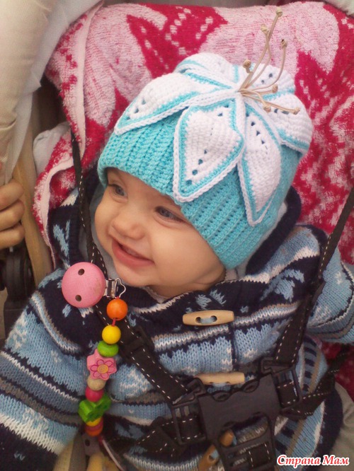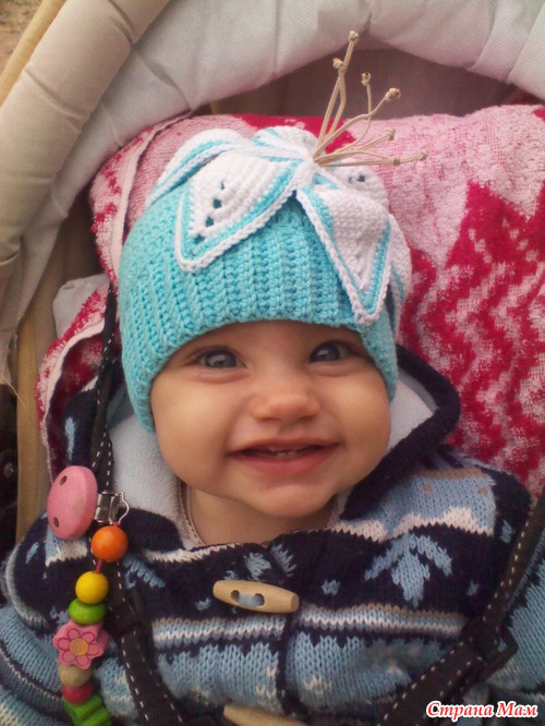У меня ниточки "Джинс", крючок № 2,5 на шапочку и 1,5 на цветочек, тычинки из отделочного шнура)