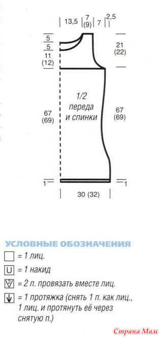 Перед: вязать так же. но с более глубоким вырезом горловины. Для этого через 11 (12) см от начала пройм за-крыть средние 16 п. и вязать далее раздельно. Для закругления по краям выреза закрыть в каждом 2-м р, 1 х 4, 1 х 3, 2 х 2 и 9 х 1 п. На высоте спинки закрыть оставшиеся 16 (20) п. плеча.