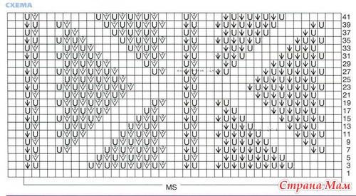 Основной узор: число петель кратно 40 + 2 (0) + 2 кром. Вязать по схеме, на которой приведены только лиц. р, в изн. р. все петли и накиды вязать изн.