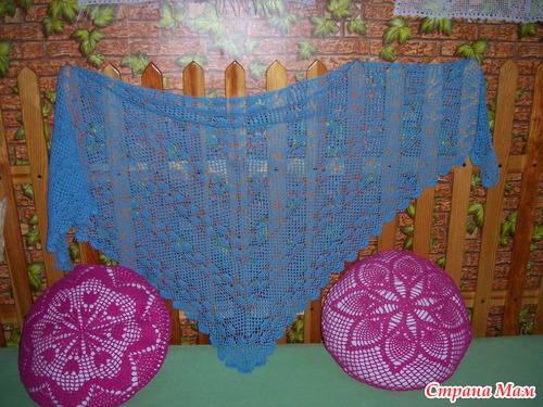 Распустив старый х/б пуловер, связала голубой топ ( есть в альбоме), а потом решила связать тонкую шаль. Узор уже не раз встречался в Стране Мам. Вот что получилось.