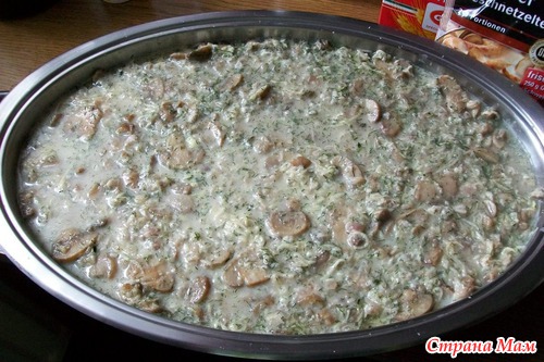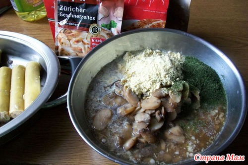 приготовить соус ( из всех ненужностей в холодильнике : здесь, покупной грибной подлив, грибы, рассол от грибов соль и специи ) можно остатки сметаны, творога, аджики, горошка зеленого, кукурузы, майонез, кетчуп и т. д.( можно просто водой или бульоном, но будет уже не так интересно )